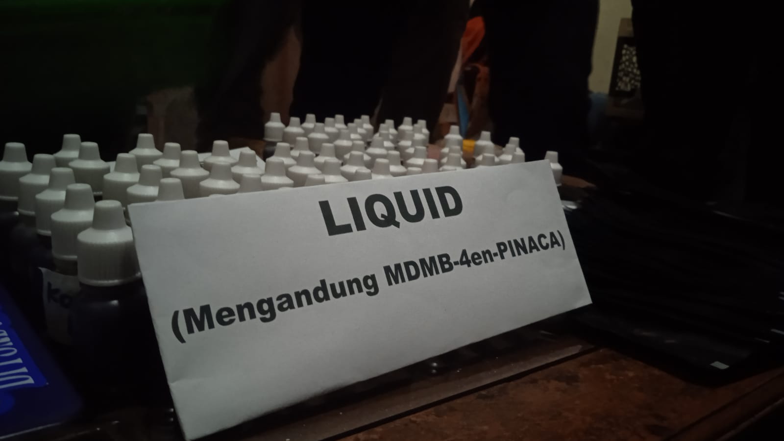 Kapolres Cimahi, AKBP Tri Suhartanto mengatakan, dari hasil penangkapan tersebut, ditemukan barang bukti berupa 585,6 gram tembakau sintetis, 95 botol liquid yang mengandung narkotika jenis MSMB-4en-PINACA, dan perlengkapan untuk memproduksi tembakau sintetis.