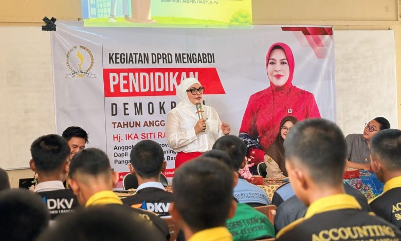 Hasanah.id – Anggota DPRD Jawa Barat, Hj. Ika Siti Rahmatika, SE, mendorong para pelajar untuk memiliki keberanian berpikir kritis dan aktif berpartisipasi dalam kehidupan masyarakat. Pesan tersebut disampaikannya dalam kegiatan DPRD Mengabdi dalam Pendidikan Demokrasi bertema “Generasi Muda Pelopor Demokrasi Indonesia” yang digelar pada Jumat, 14 November 2025, di SMK Negeri 1 Rancah, Desa Cileungsir, Kabupaten Ciamis.